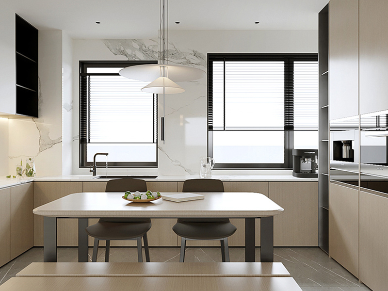 浅木棕橱柜串联操作与互动区,米白台面呼应大理石墙,黑框窗引光入室。备餐时,木的温润与石的清透交融;简餐时刻,岛台化身为社交角。色彩以木棕为基,糅合米白、灰调,借“自然材质+开放布局”,诠释烹饪与交流共生的原木烟火。