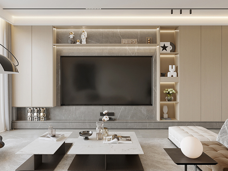 木色柜体围合电视区,大理石肌理显格调,暖光漫溢层板。观影时,米白沙发承托松弛;会客时,摆件与木、石对话。色彩在木棕、米白、灰间交织,以“收纳+材质碰撞”,构建温馨精致的原木起居场。