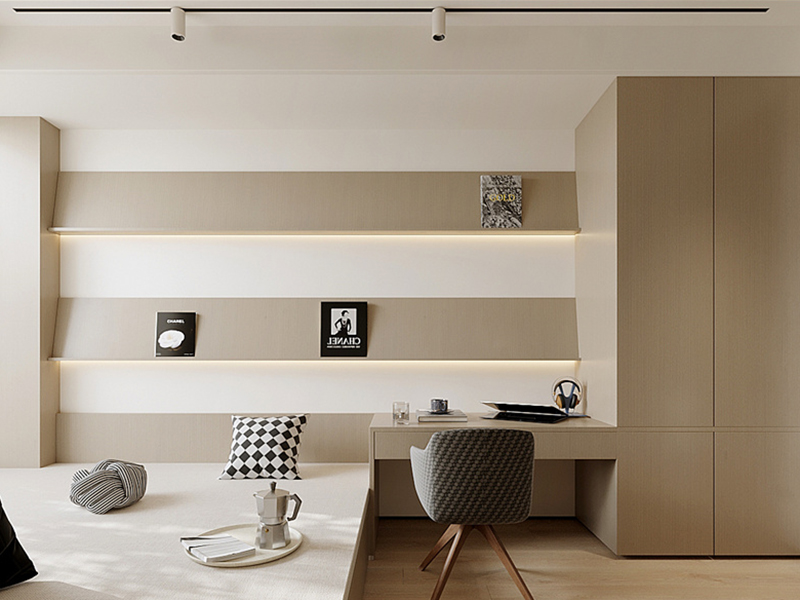 木色书架满墙,悬浮书桌嵌浅调墙,榻榻米区藏休憩意。阅读时,自然光映书页;闲卧时,抱枕托慵懒。木棕糅合米白、浅灰,借“功能复合+柔采光”,让思考与放松在原木氛围流转。
