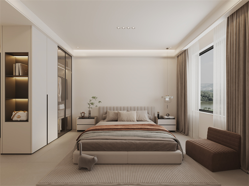 米白与暖棕交织出静谧氛围,嵌入式灯光柔化柜体边界。大窗引自然光漫入,简洁床具承托睡眠,收纳与休憩功能共生,奶油风的温润质感,让卧室成为私享的治愈角落。