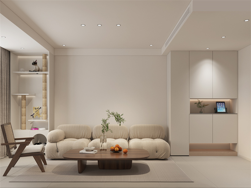 奶油色沙发如云朵般蓬松,木色茶几、藤编椅添自然质感,角落猫爬架巧妙融入。日常会客或独处时,柔和色调与简洁陈设传递松弛感,奶油风的温柔让客厅成为人与宠物共享的治愈场域。