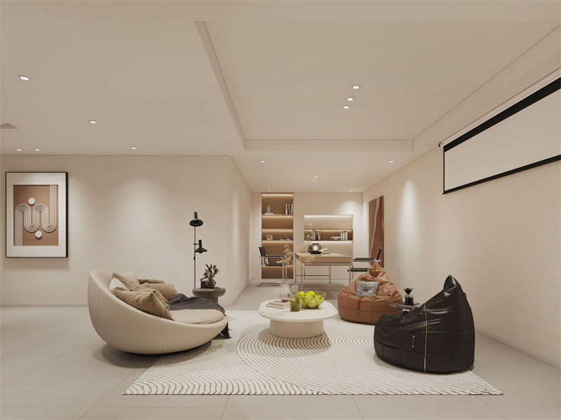 奶油色铺就温柔基底,暖棕与黑色单品点缀层次。圆润座椅、豆袋营造松弛感,后方办公区可轻处理事务,柔和灯光交织简约线条,让观影休闲与轻工作场景自然切换,尽显奶油风的治愈与实用。
