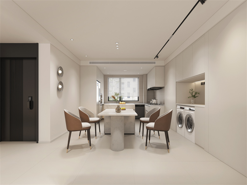 奶油白主调搭配焦糖色餐椅,大理石纹理餐桌显精致,与厨房、洗衣区动线流畅。用餐时暖光包裹,日常备餐、清洁因一体化布局更有效率,简约中藏着奶油风的温馨实用。