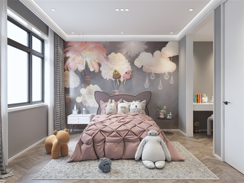 以灰、粉等柔和色调营造童趣氛围,云朵植物主题壁画充满想象力,猫耳造型床头、毛绒玩偶增添活泼感,简约线条中藏着新中式的雅致柔和。日常是孩子玩耍、休憩的梦幻小天地,在温馨色彩里传递出治愈的居住体验。