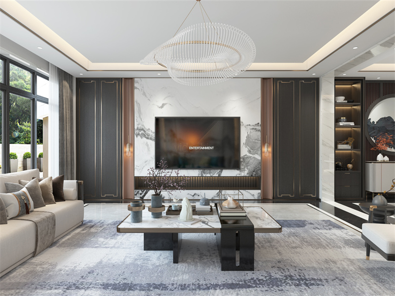 白、灰与深棕为主色调,大理石电视墙搭配金属线条,对称柜体嵌入山水元素,艺术吊灯与简约沙发平衡古典与现代。家人围坐观影、好友小聚时,大气布局与东方细节交融,尽显新中式的雅致舒适与社交包容性。