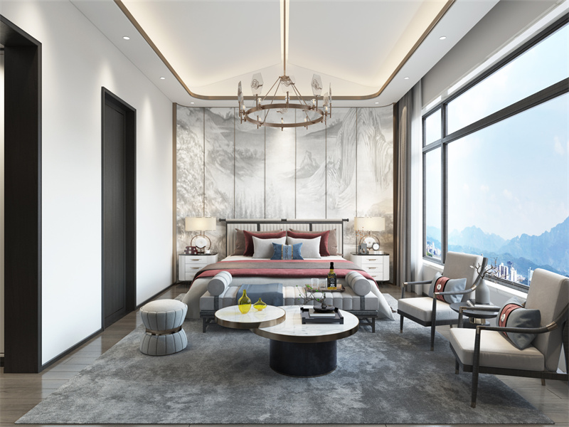 白墙衬以山水纹背景墙,金属吊灯与木质家具相融合,大窗引自然景致入室。日常休憩时,东方意境与现代舒适感交织,既适合睡前静享阅读,也能在山水意象中松弛身心,营造出静谧雅致的休憩场域。