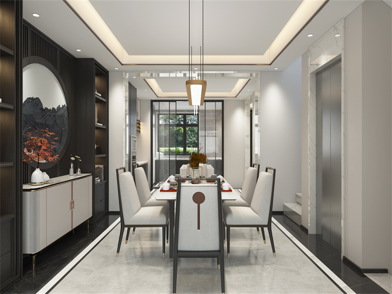 灰白基底搭配深棕柜体,圆形山水装饰等传递东方韵味,长餐桌配简约餐椅,餐边柜兼顾收纳与展陈。家人围坐用餐时,柔和灯光与中式细节交融,让餐厨互动既具仪式感,又流露出现代生活的烟火气息。