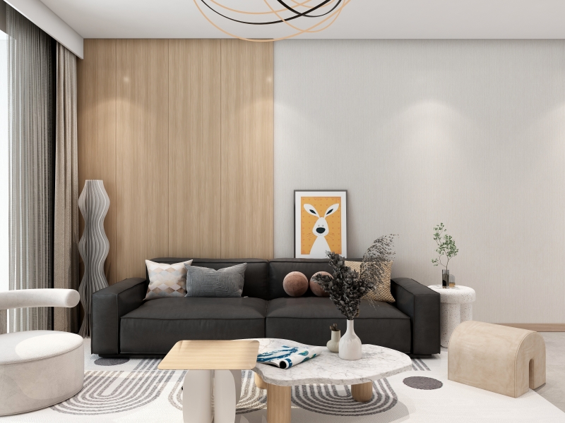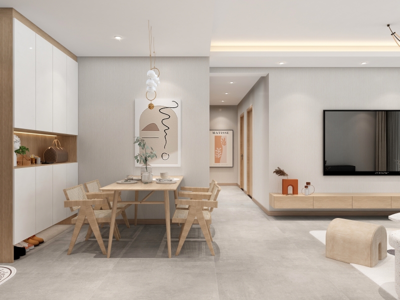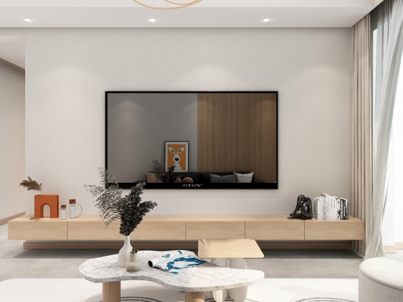 客厅把 “极简美学” 玩出花,原木电视柜简洁利落,艺术摆件、杂志错落其上,似在无声讲述生活态度。大屏与墙面肌理呼应,让空间既有 “家的温度”,又有 “展厅的高级感”,适配现代生活的多元场景。