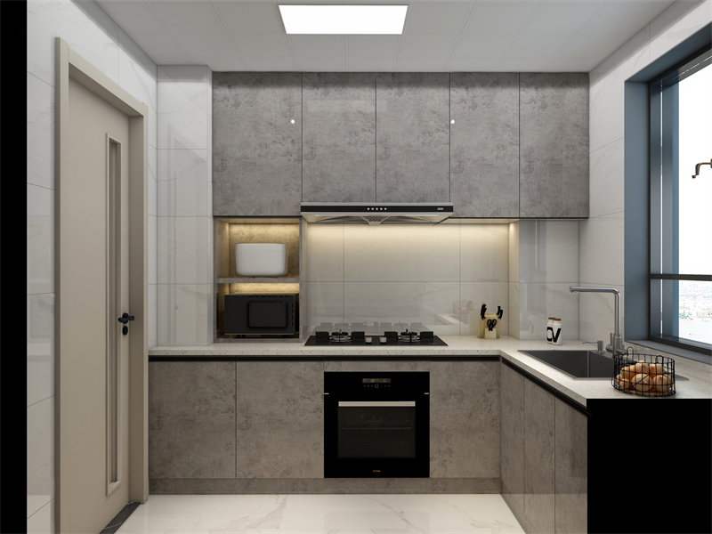 深灰橱柜搭配浅白墙地,冷调配色尽显理性秩序。开放式收纳格与隐藏式柜体平衡实用与美观,嵌入式电器消弭杂乱。在这里,烹饪是专注的创作,备餐时的利落操作、用餐后的简洁收纳,都契合极简风格对生活的追求。