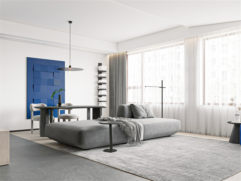 整体以白、灰、蓝构建极简秩序,开放式布局模糊空间边界。客厅沙发、书房长桌连通,光线自由穿梭。少即是多的设计,适配工作、休憩无缝切换,无论是专注办公,还是慵懒躺卧,都能在简洁氛围里,寻得松弛生活节奏。