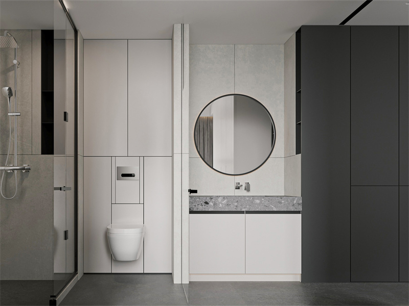 以灰白灰为主色,通过块面拼接、圆形镜打破单调。壁挂马桶、嵌入式收纳设计,释放空间。日常洗漱,在简洁布局里效率便捷,极简风格用克制的美学,适配现代生活对整洁、实用的追求。