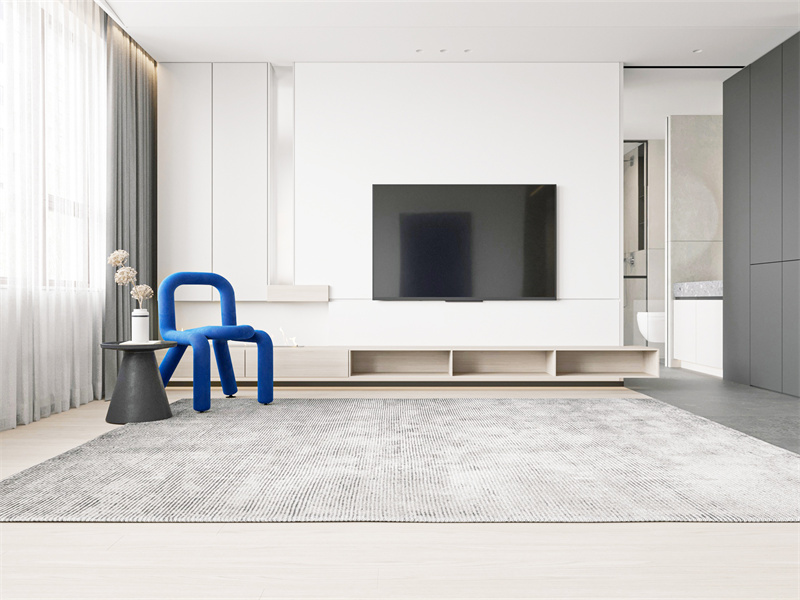 以白、灰为底色,电视墙线条利落,搭配悬空电视柜与造型单椅。蓝色家具跳脱点睛,消弭极简的单调。日常可静坐赏景、阅读,空间开放流畅,契合现代快节奏下追求的“断舍离”生活,用减法设计,装下对纯粹的向往。