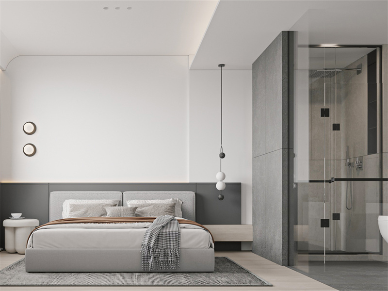 延续白、灰主调,墙面摒弃冗余装饰,悬浮床、简约吊灯简化形态。玻璃隔断划分卫浴,让空间通透又具层次。晨起迎接柔光,睡前静享静谧,极简设计剔除繁杂,为睡眠打造“无压感”场域,回归本真休憩体验。