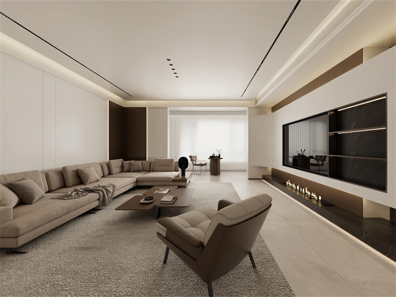 以简洁的白色、米色为主调,搭配深棕色点缀,营造出沉稳又不失温馨的氛围。无主灯设计结合线性灯光,让空间更显开阔明亮。宽大的浅米色沙发搭配简约茶几,适合家人围坐观影,或是朋友相聚聊天,开放式布局让互动更加自由畅快。