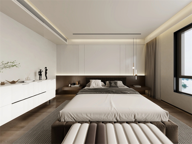 以白色和浅木色为基础,营造宁静舒适的睡眠环境。深棕色床头背板作为视觉焦点,搭配灰色床品,层次丰富。窗边的吊灯设计独特,柔和的光线为睡前阅读或休憩,提供惬意氛围。