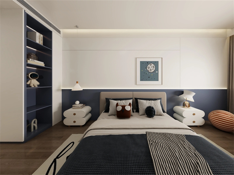 以蓝白为主色调,清爽又充满活力。白色墙面搭配深蓝色床头背景,活泼而不失稳重。可爱的动物造型抱枕和趣味挂画,增添童趣。定制的组合柜兼具收纳和展示功能,方便孩子整理玩具与书籍,助力孩子在舒适空间中快乐成长。