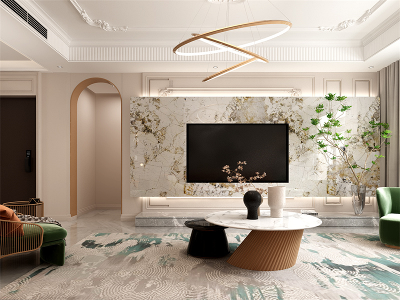 以米白、浅棕为底,搭配大理石背景墙,法式雕花与弧形元素增添浪漫。绿植、艺术摆件点缀,适配亲友相聚、休闲观影,灯光柔和,让客厅成为优雅且舒适的社交休憩核心区。