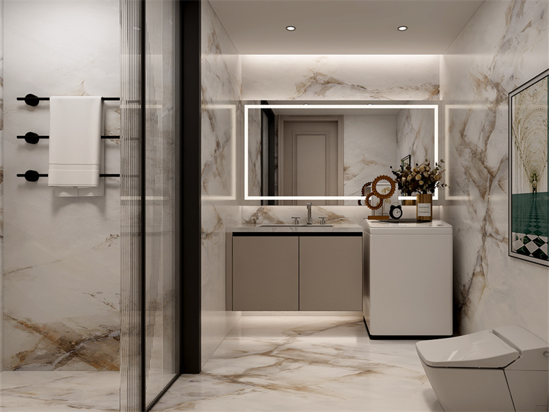 大理石纹理铺满空间,米白与暖棕交织,营造优雅轻奢氛围。充足收纳与整洁布局,满足日常洗漱需求,灯光设计柔和,让卫浴空间既具实用功能,又显法式的浪漫雅致,为居家生活增添舒适感。