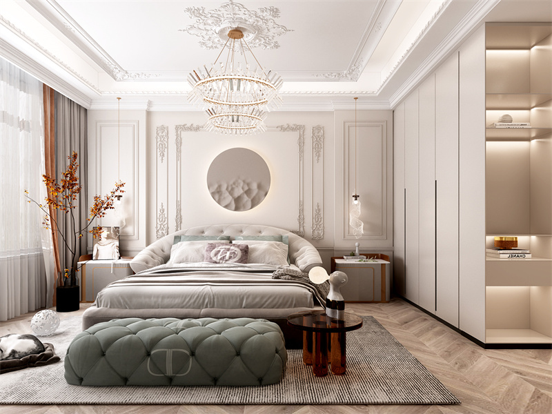 米白、浅灰搭配,法式雕花吊顶、水晶吊灯尽显浪漫。柔软床具、精致床头柜,适配睡前阅读、休憩,充足收纳满足衣物存放,整体设计温馨舒适,为居住者打造静谧且有格调的私域空间。