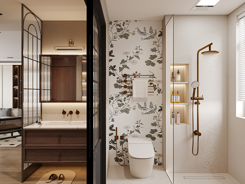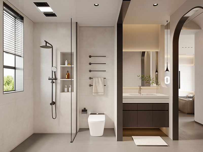 三分离布局形式是指,将卫生间彻底拆分为“淋浴区、如厕区、洗漱区”三个独立空间,两两之间用墙体或玻璃隔断,洗漱区还可外移到卫生间门口。