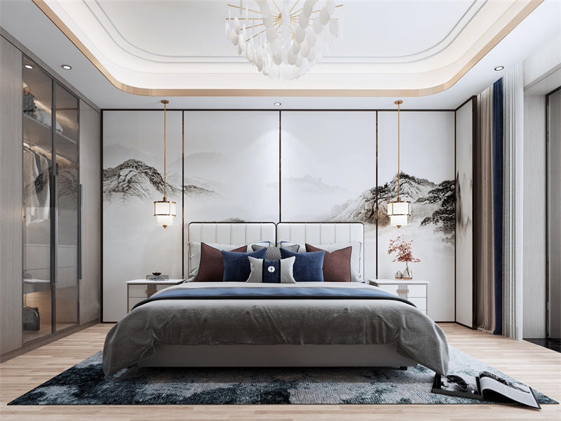 以灰白、深蓝为主,山水墙饰与中式吊灯,营造出宁静悠远的氛围。舒适的床具与充足收纳空间,满足睡眠与储物需求,适合卸下疲惫,享受休憩时光,体现新中式的舒适与诗意。
