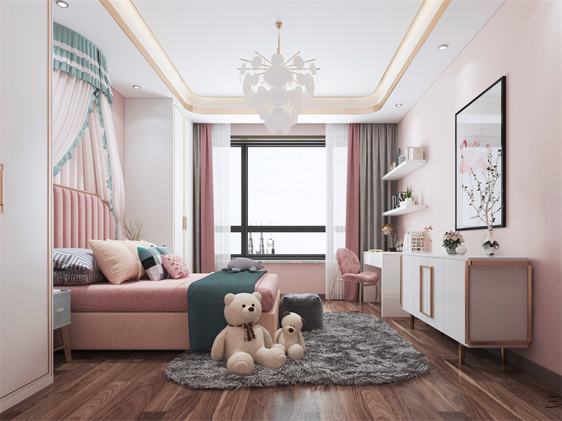 粉色为主色调,搭配浅蓝、白色,柔和温馨。帷幔床具、毛绒地毯与玩偶,营造出可爱氛围,书桌区域满足学习需求,适合孩子玩耍、休憩与学习,在甜美中融入新中式的精致细节。