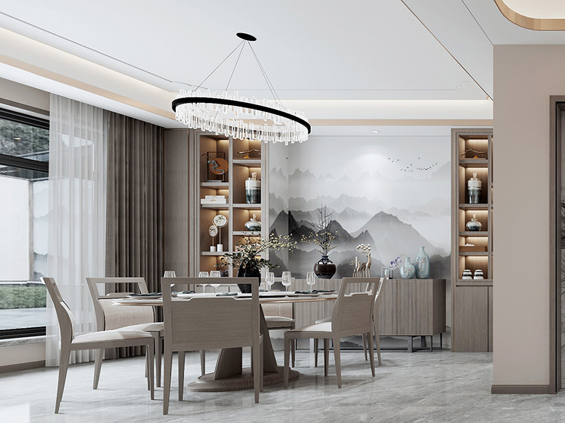 浅木色与白色搭配,山水背景墙意境悠远。圆形餐桌搭配简约餐椅,水晶吊灯提升氛围,适配家庭聚餐、宴请宾客,两侧陈列柜展示器物,让用餐时光在雅致氛围中,感受新中式的文化底蕴。