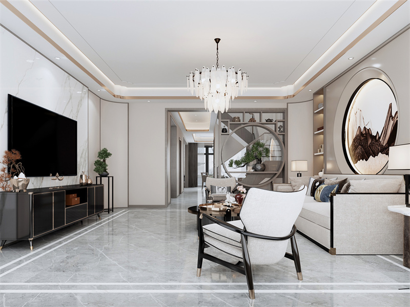 以米白、浅棕为主色调,搭配大理石地面,典雅大气。中式圆形装饰与山水元素挂画,营造出东方韵味,舒适的沙发组合适配会客、休闲,水晶吊灯增添精致感,尽显新中式的雅致与格调。