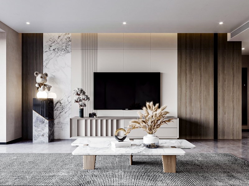客厅将大理石的冷冽与木色的温润相融,电视墙如艺术画布。毛绒摆件添了份俏皮,干花在茶几上舒展,每一处细节都在说:“家,是能安心发呆的角落”,适配独处放空、亲友小聚的多元生活场景。