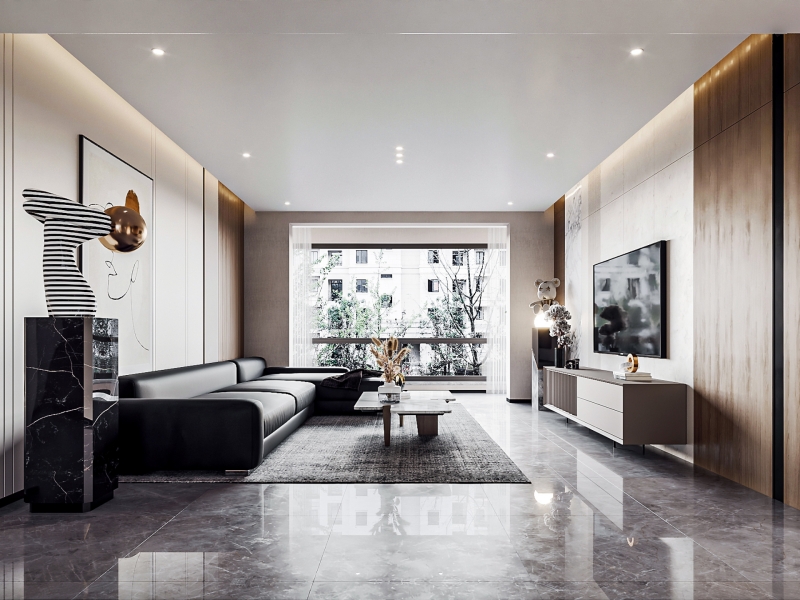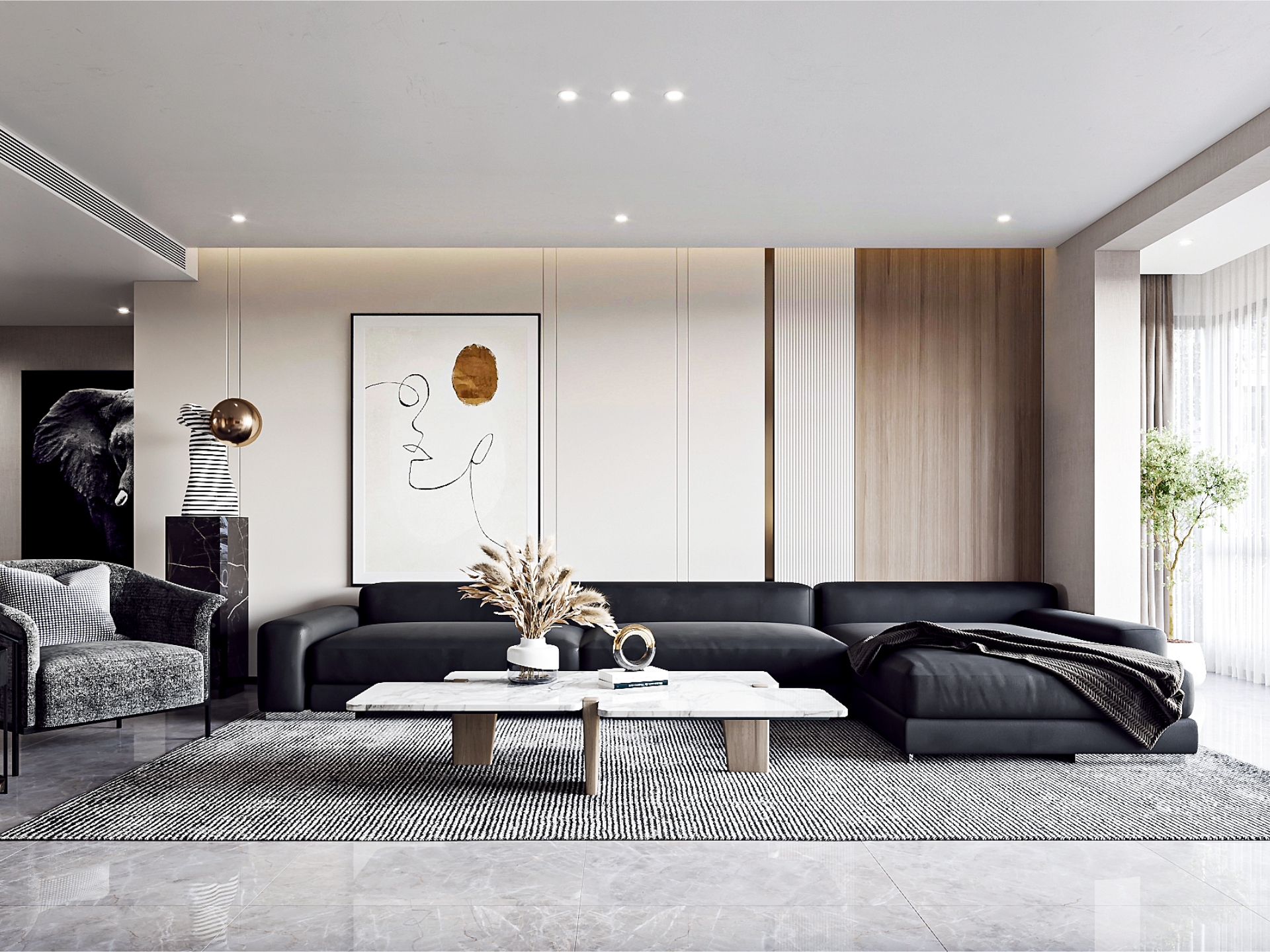 客厅用深黑沙发锚定沉稳,木色背景墙揉进自然暖意,线条艺术画似在空间写诗。大理石茶几承托着干花与摆件,阳光透过纱帘漫入,窝在沙发里,仿佛能卸下所有疲惫,让舒适与精致相互依靠融合成为生活的主旋律。