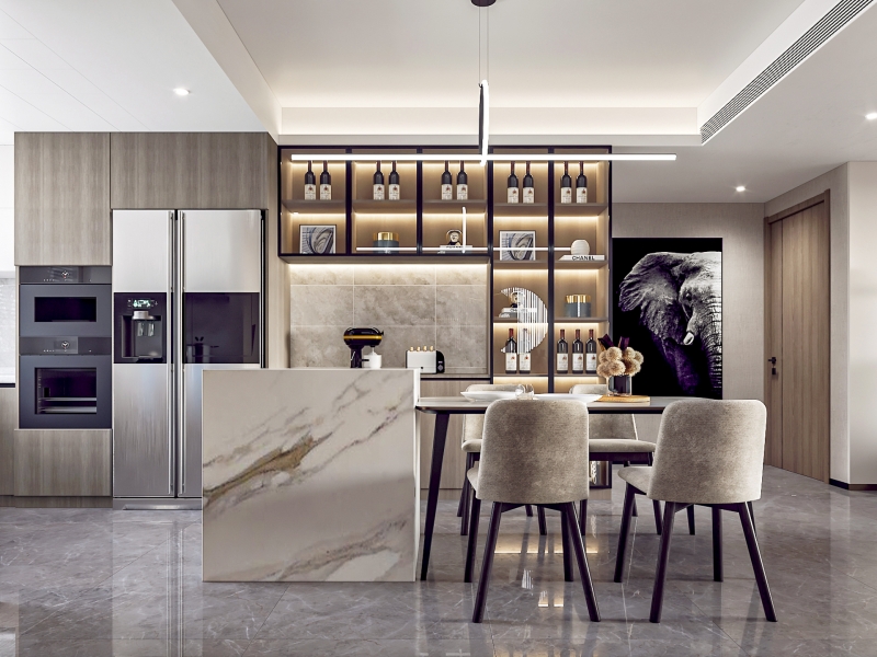 餐厨区以暖木、金属灰交织出精致感,大理石中岛如艺术孤品,酒柜灯光衬得瓶身似琉璃。在这里,备餐时能与餐厅亲友谈笑,用餐时又有大象艺术画添氛围,把 “烟火气” 和 “仪式感” 揉成生活日常。