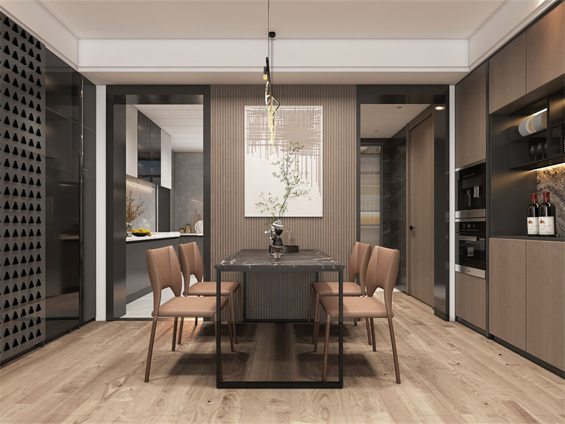 深灰大理石桌面与暖棕餐椅形成质感对比,线条利落的吊灯与艺术挂画提升空间格调,兼具展示与收纳功能的柜体设计,让空间既显精致,又能适配日常用餐、轻食小聚等生活场景,尽显现代意式的实用与美感。