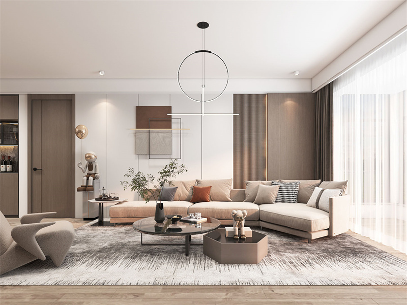 以米白、木色等为基底,撞色抱枕为空间注入活力,简约造型的沙发、茶几搭配艺术感环形吊灯,开阔通透的布局适配家庭休闲、好友小聚等场景,传递出现代意式风格的轻奢舒适与艺术氛围。