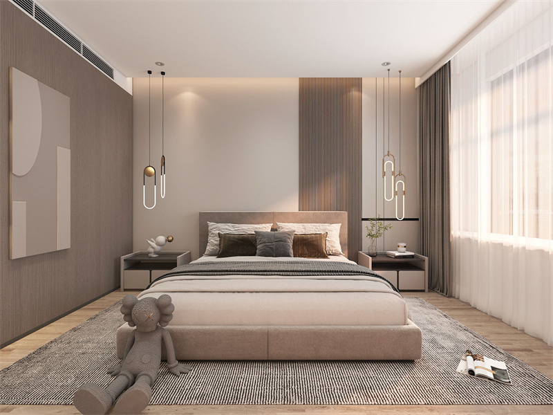 选取暖棕、米灰和木色等柔和色调,线条简洁利落,精致吊灯与艺术摆件点缀其间,舒适床品与充足收纳兼顾实用与美感,营造出静谧松弛的氛围,适配卸下疲惫、享受独处的休憩时光,尽显现代意式的优雅质感。