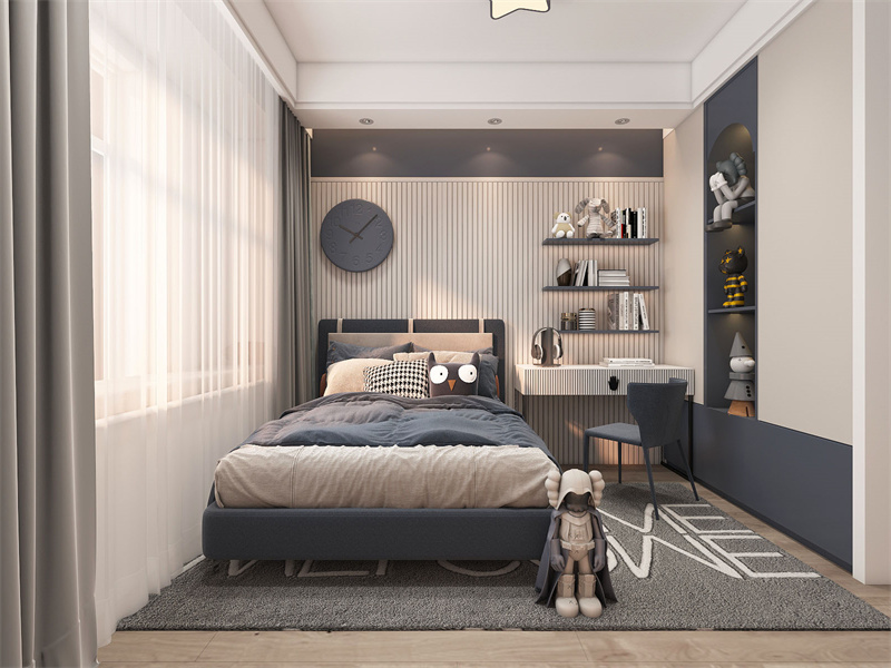 以灰、米色为主色调,蓝色点缀,简约线条勾勒空间,搭配童趣玩偶与摆件,既保留现代意式的雅致质感,又通过活泼细节适配孩子学习、玩耍与休憩的多元需求,营造出充满童真又不失格调的成长空间。