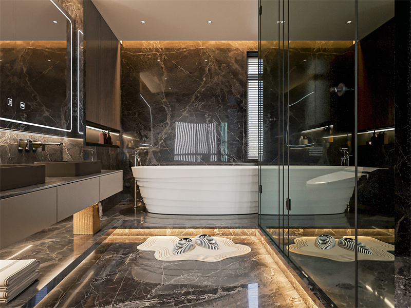 以黑金色大理石为主,搭配精致洁具与层次灯光,色彩优雅有质感。适配高品质卫浴享受的生活方式,大理石材质与金属五金结合,打造实用与奢感兼备的卫浴场景。