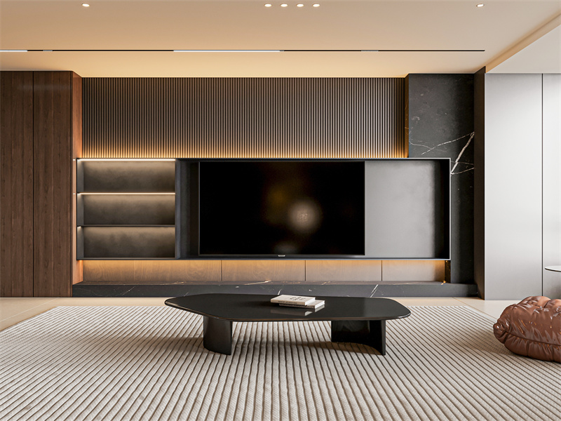以黑棕、暖金色为核心,融合大理石与金属细节,空间通透雅致。适配社交休闲的生活方式,简洁家具与层次灯光结合,营造轻奢感十足的起居空间。