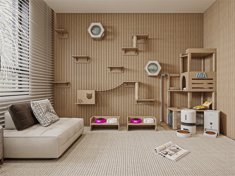 以暖木色为主调,搭配柔和中性色,营造温馨自然氛围。适配宠物互动与休闲的生活方式,木质元素与简洁设计结合,既满足宠物玩乐需求,又为主人提供舒适陪伴空间,在现代轻奢中融入宠物友好的温馨质感。